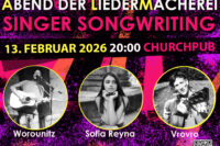GOLDENER ABEND DER LIEDERMACHEREIFreitag, 13.2.2026 20:00 International Churchpub, Radetzkystraße, 1030 Wien Vrovro & special guestseine Bühne für zeitgenössische Liedermacherei freie… Weiterlesen ALM FEBRUAR- ABEND DER LIEDERMACHEREI @ CHURCHPUB