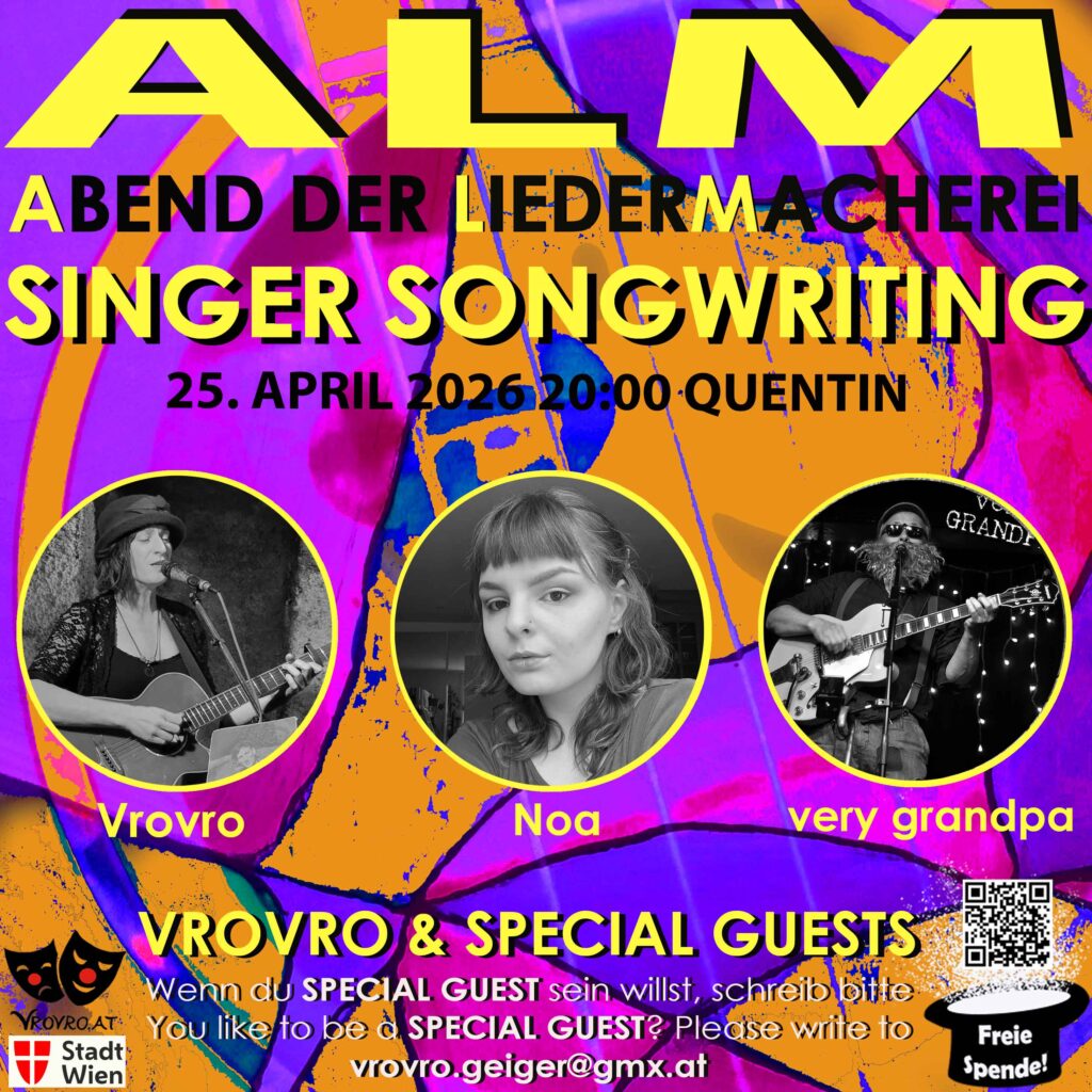 Vrovro Geiger (früher als Lavanda Kawumm) singt ihre Lieder und lädt beim ALM (Abend der Liedermacherei) andere Liedermacher_innen dazu ein, mit ihr die Bühne zu teilen.