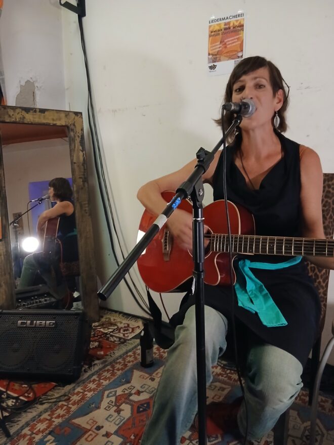 Vrovro Geiger (früher als Lavanda Kawumm) singt ihre Lieder und lädt beim ALM (Abend der Liedermacherei) andere Liedermacher_innen dazu ein, mit ihr die Bühne zu teilen.