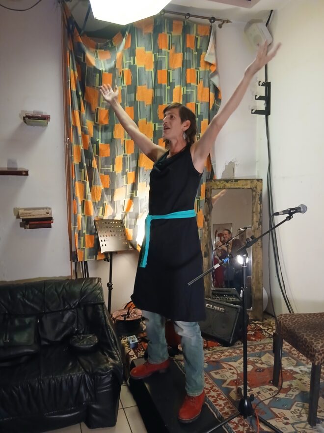 Vrovro Geiger (früher als Lavanda Kawumm) singt ihre Lieder und lädt beim ALM (Abend der Liedermacherei) andere Liedermacher_innen dazu ein, mit ihr die Bühne zu teilen.