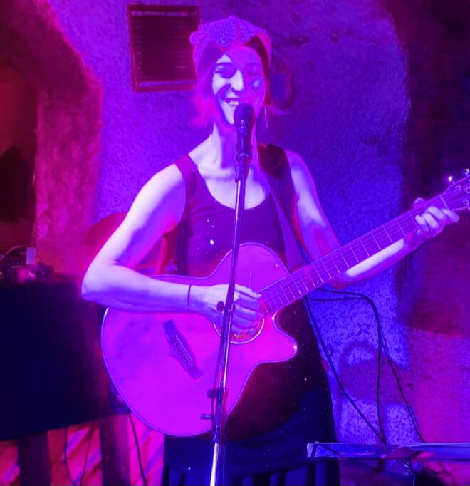 Vrovro singt selbstgedichtete Lieder und erzählt die Geschichte von ihrer Freundinnenschaft zu Lavanda Kawumm, der Clownin vom Mond